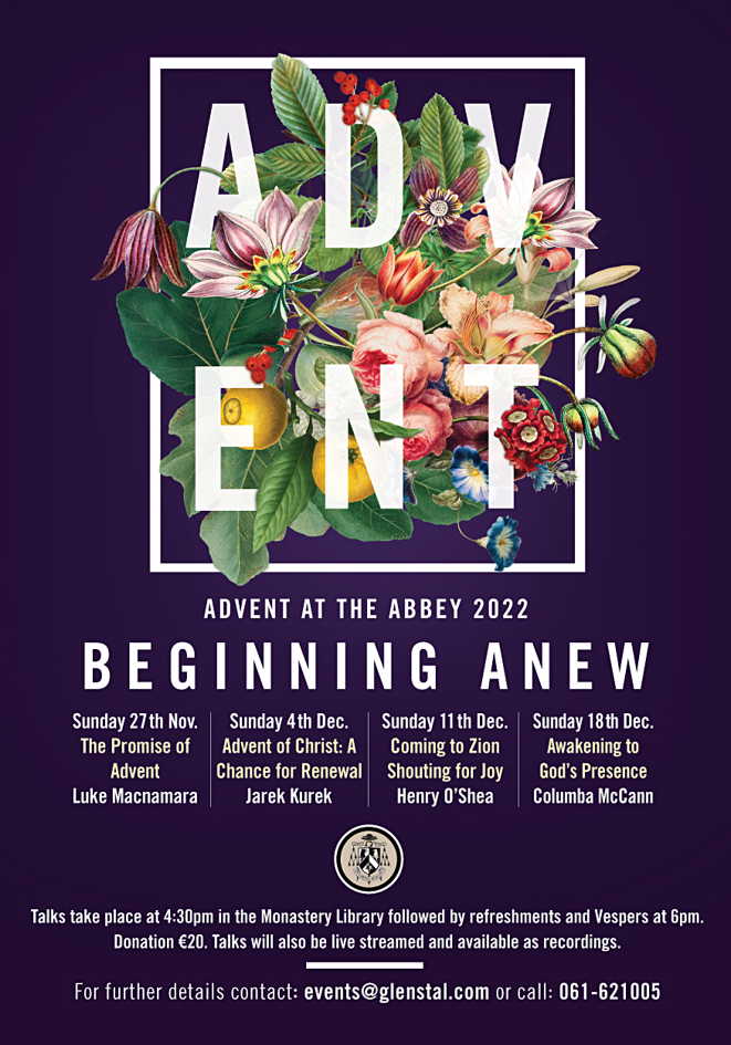 A series of Advent talks at Glenstal Abbey. The talks started on Sunday 27th November and continues on each Sunday leading to Christmas. The talks take place at 4.30pm in the Abbey Library and are followed by refreshments and sung evening prayer. Suggested donation €20. The talks are also live streamed and available as recordings. For further information, email events@glenstal.com or phone 061 621 005. See poster attached with the details.