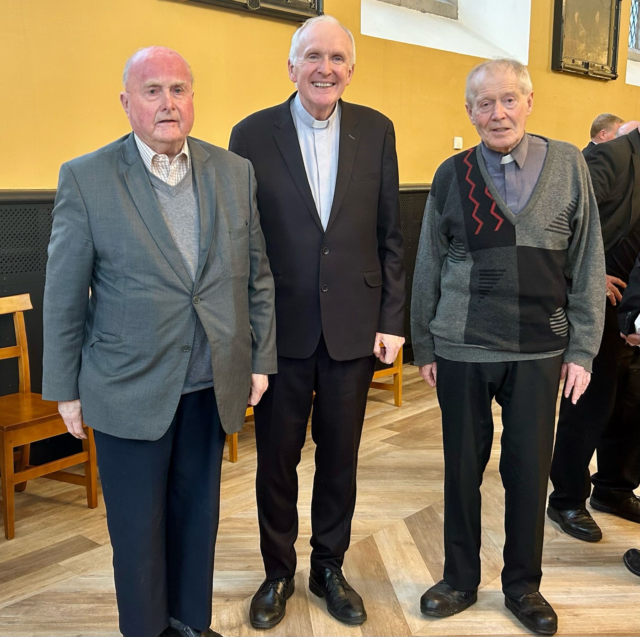 Canon Donough O’Malley celebrating his Diamond (60 years ordained) Jubilee and Canon Johnny Daly celebrating his Golden (50 years ordained) Junilee pictures with Bishop Brendan Leahy in Maynooth.