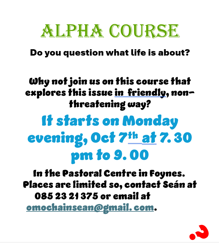If you would be interested please register, as places are limited. Attendance is open to all in the 4 parishes that make up the Pastoral Area and will be held in the Pastoral Centre (old AIB) in Foynes each Monday night for 10 weeks, starting on Monday October 7th to 9th December at 7.30pm each evening.