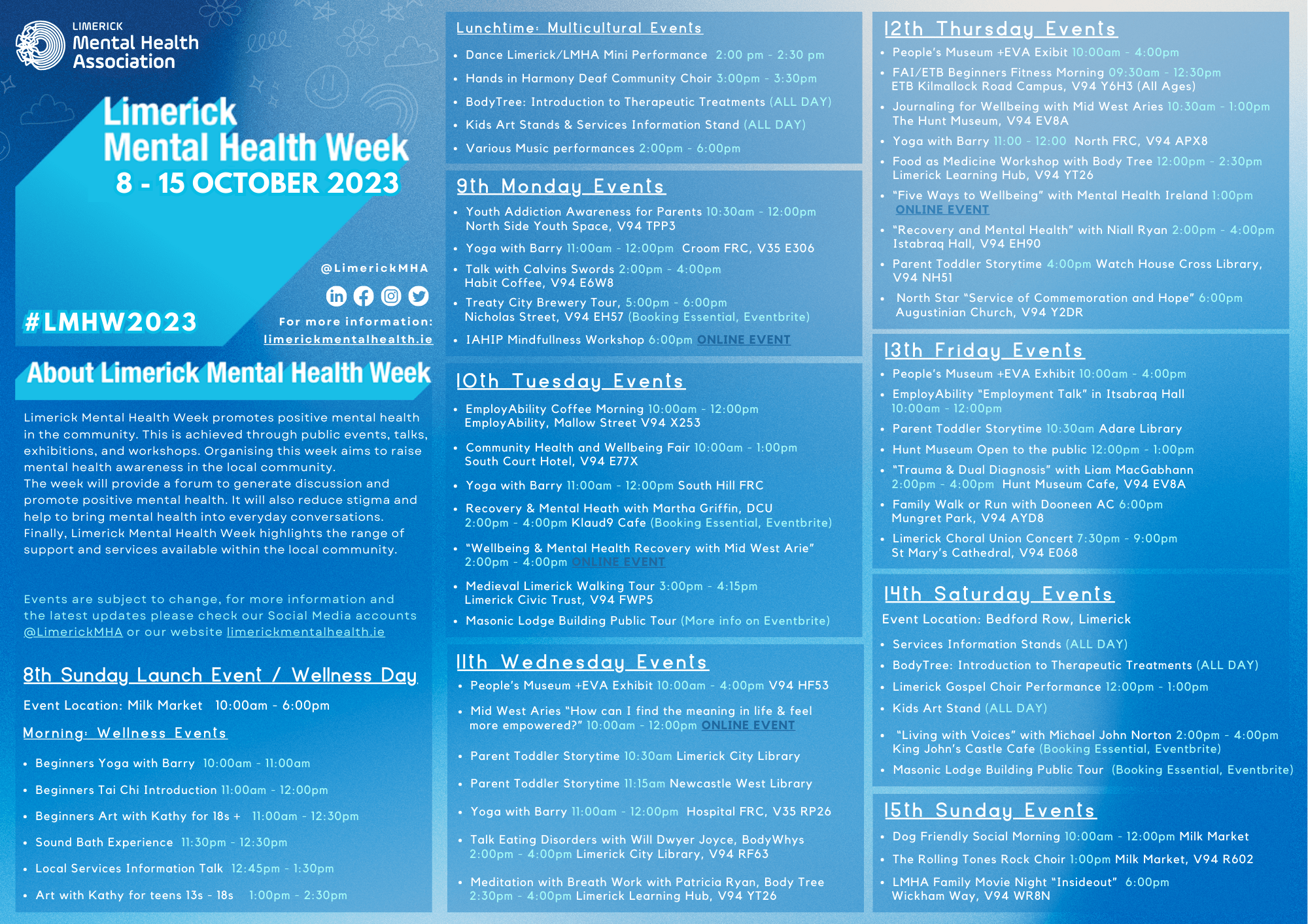 To ensure inclusivity and environmental responsibility, LMHW 2023 will provide a range of digital posters and timetables for download and electronic display. For more information or to contribute by hosting or fundraising an event for Limerick Mental Health Association, please contact info@limerickmentalhealth.ie. Every support, no matter how small, is greatly appreciated.