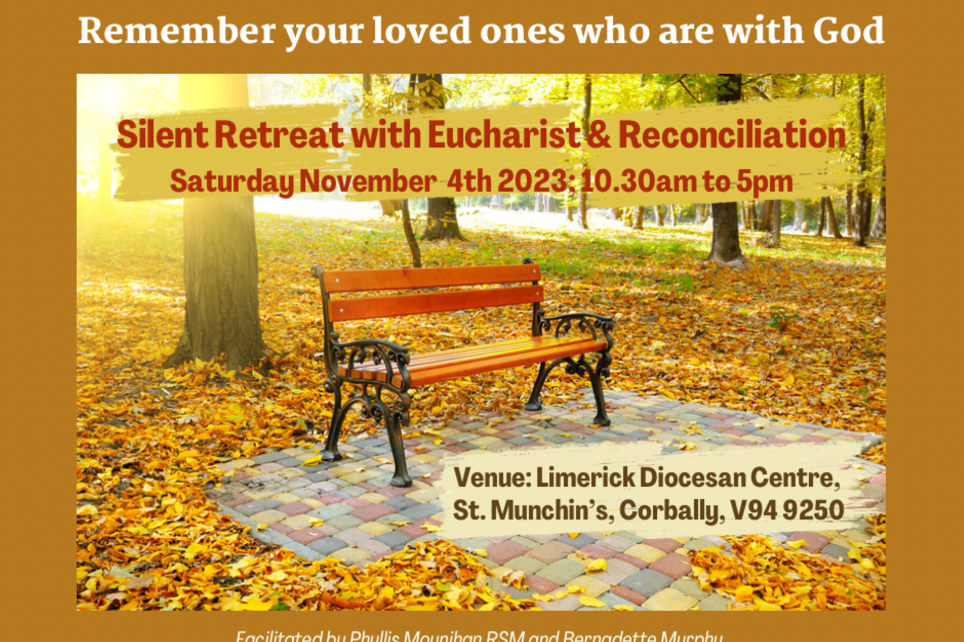 Remember your loved ones who are with God: Silent Retreat facilitated by Sr Phyllis Moynihan and Bernadette Murphy with Eucharist & Reconciliation, Saturday November 4th; 10.30am to 5pm in Limerick Diocesan Centre, St. Munchin’s, Corbally, V94 9250. Reserve your place by contacting Phyllis at 087 963 6893 or email: moynihanphyllis525@gmail.com. Bring your own packed lunch, tea, coffee, and snacks provided. Donation: €20.