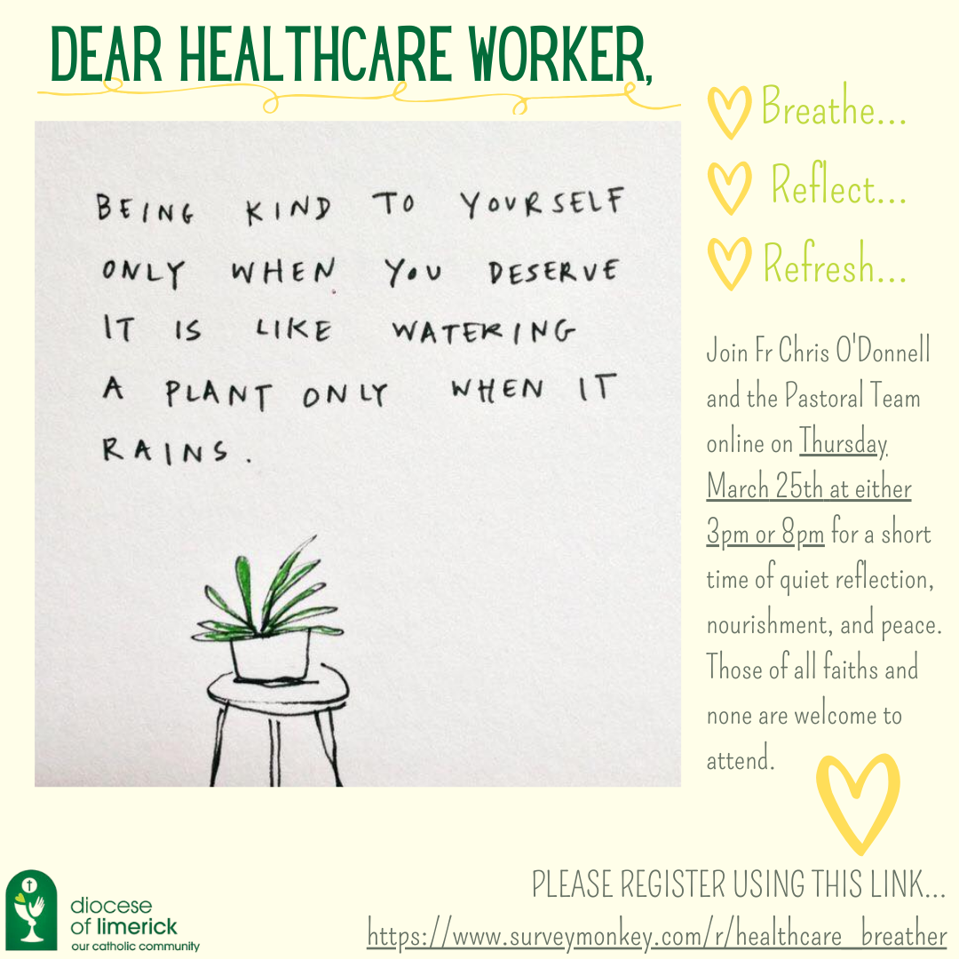 Fr Chris O’Donnell and the Pastoral Outreach team are offering another opportunity for front-line healthcare workers to take time out Thursday 25th of March. There will be two sessions on the day, one at 3pm and another at 8pm. You can register on the link below to receive the Zoom link: