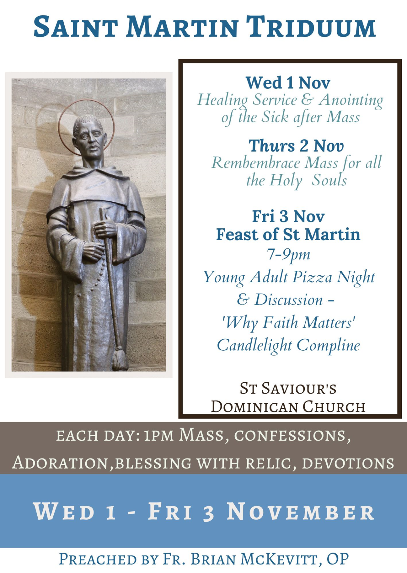 Join Fr. Brian McKevitt, O.P. for the 1pm daily Mass, followed by confessions, adoration, blessing with the relic of St. Martin, as well as Healing service & anointing of the sick (1 Nov); Mass for the Holy Souls (2 Nov); Young Adult Pizza Night & Discussion 7-9pm (3 Nov).