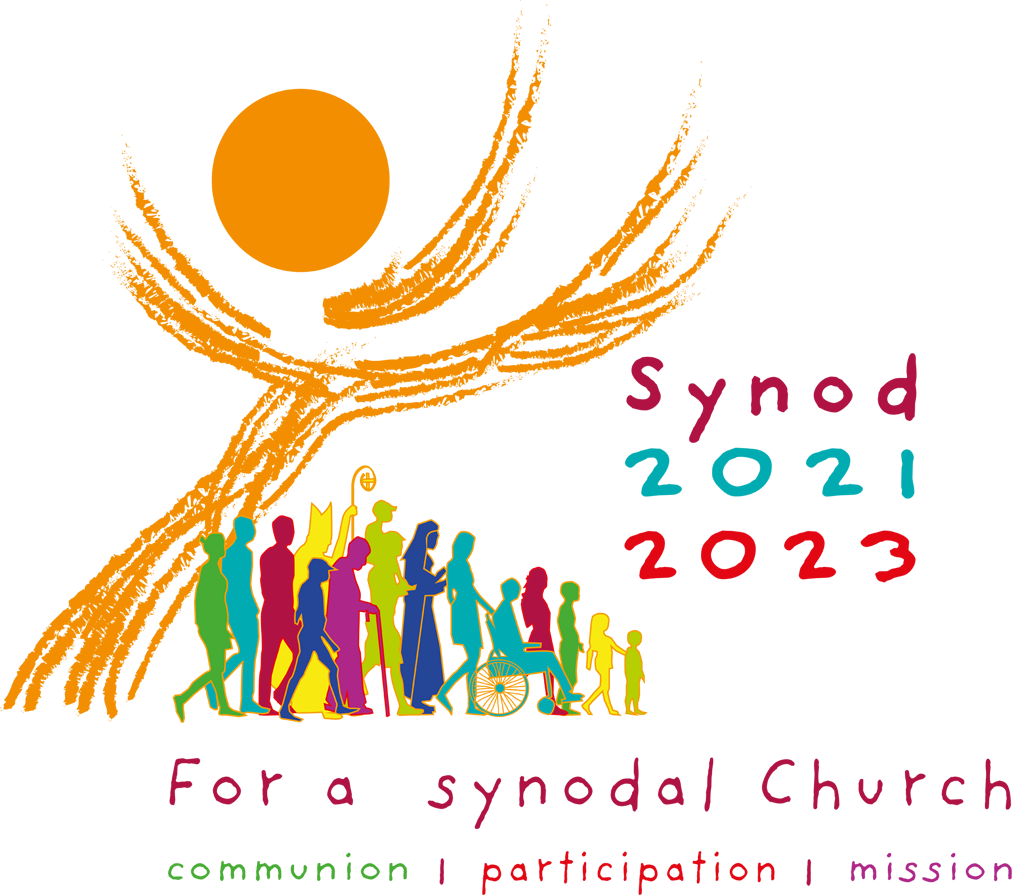 The horizontal baseline: "For a synodal Church: communion, participation and mission” runs from left to right in the direction of this march, underlining and strengthening it, to end with the title "Synod 2021 - 2023", the high point that synthesizes the whole.